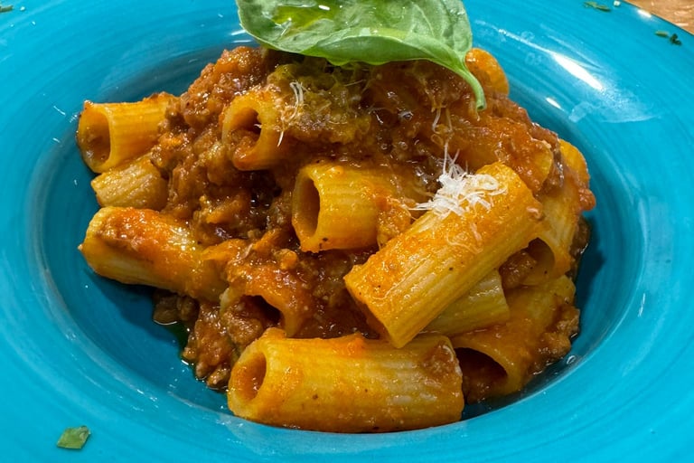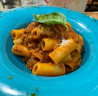 Nuestro Rigatoni in Salsa Bolognese es un auténtico deleite para el paladar. La pasta rigatoni, cocida al dente, se mezcla con una rica salsa de ragú hecha de carne picada de ternera, cebolla, apio, zanahoria y tomate. Cada bocado ofrece una perfecta armonía de sabores y texturas que te conquistará.
