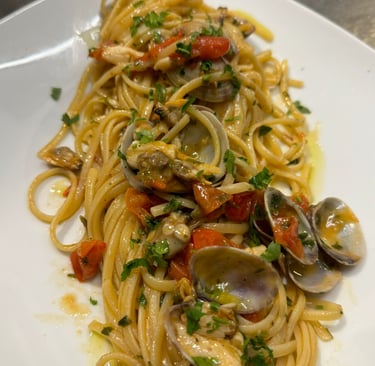 Nuestra pasta fresca con salsa de mariscos es un deleite para los amantes del mar. Preparada con gambas jugosas, calamares tiernos y tomates cherry frescos, cada plato ofrece una armonía de sabores del océano y la tierra. La pasta absorbe perfectamente la rica salsa, creando una experiencia culinaria auténtica y deliciosa que transporta tus sentidos al Mediterráneo.