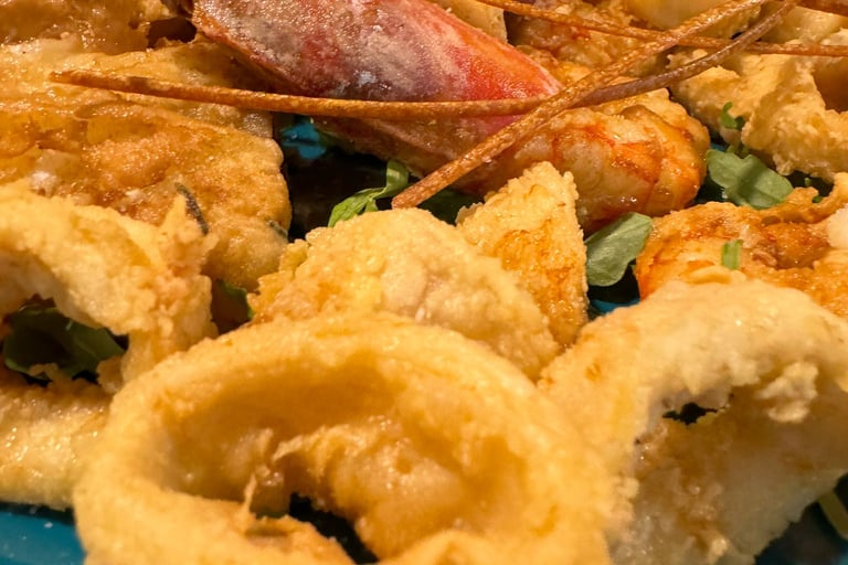 Nuestro Cuoppo di Mare es una deliciosa fritura de mariscos que combina calamares tiernos, gambas jugosas, bacalao crujiente y boquerones sabrosos. Con una mezcla de texturas crocantes y sabores del mar, perfectamente sazonados y fritos a la perfección, este plato es ideal para compartir y captura la esencia del océano en cada mordisco.